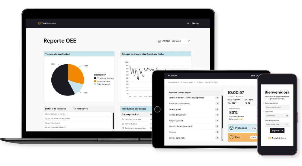 Ofrecemos una plataforma de OEE en tiempo real fácil de implementar, con reportes confiables y soporte cercano, diseñada para que tu planta sea más eficiente, competitiva y rentable.